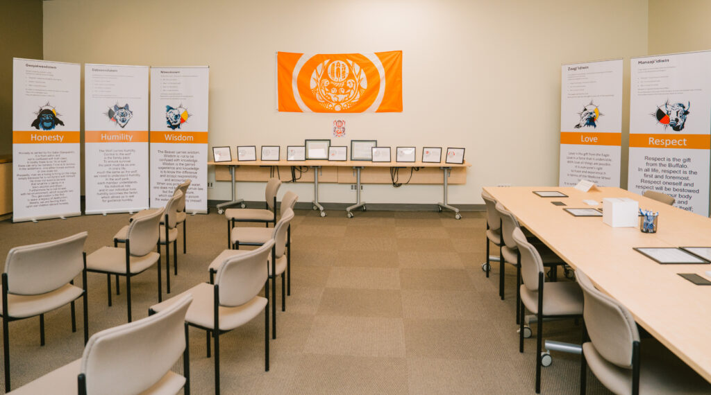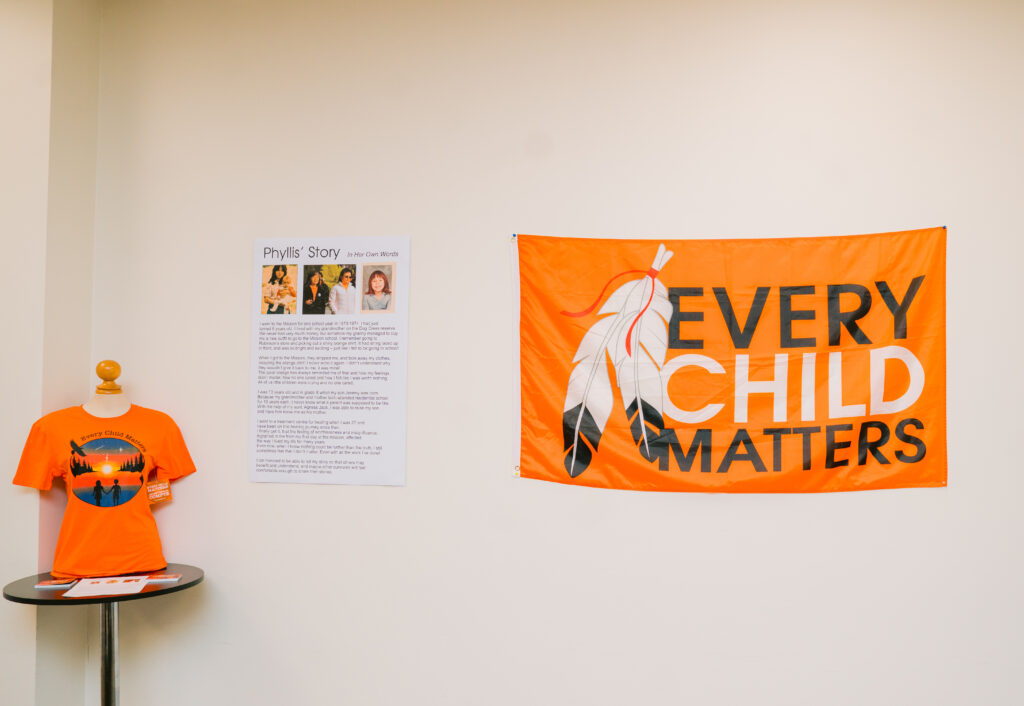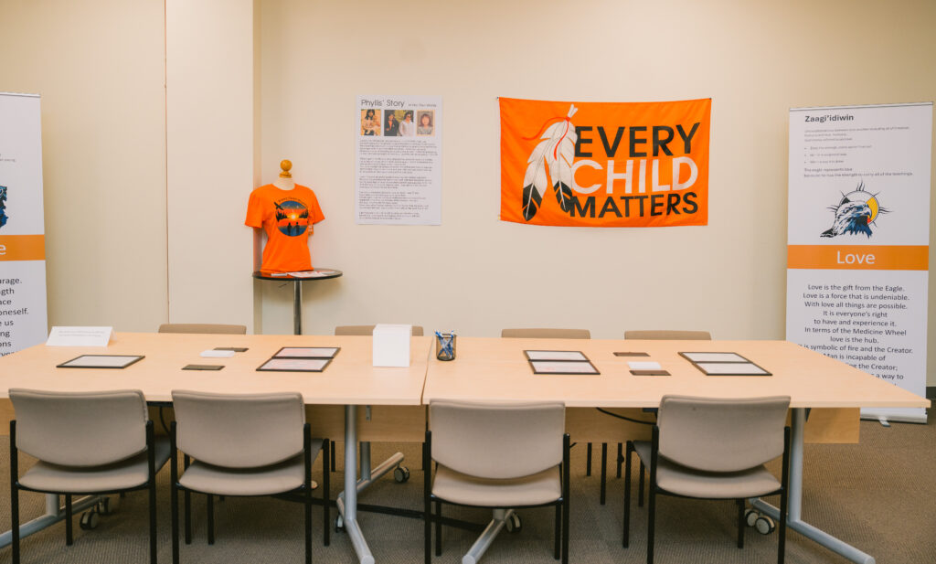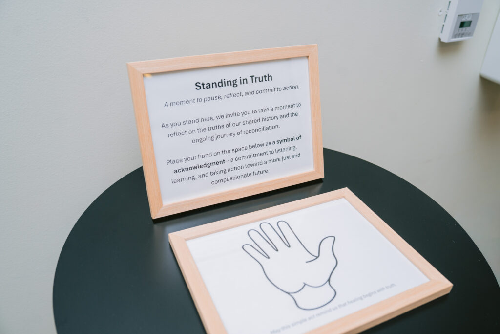 Cet engagement signifie également encourager et soutenir notre personnel à participer à des événements festifs et éducatifs. Cette année, au lieu d’organiser un seul événement pour marquer le 30 septembre, nous avons créé une expérience d’apprentissage autoguidée de plusieurs semaines intitulée: Dans la vérité à notre site d’Isabella Street. Cet espace interactif (illustré ci-dessous) a été conçu pour susciter la réflexion, la conversation et l’apprentissage à travers des documents, des récits historiques et des vidéos soigneusement sélectionnés.